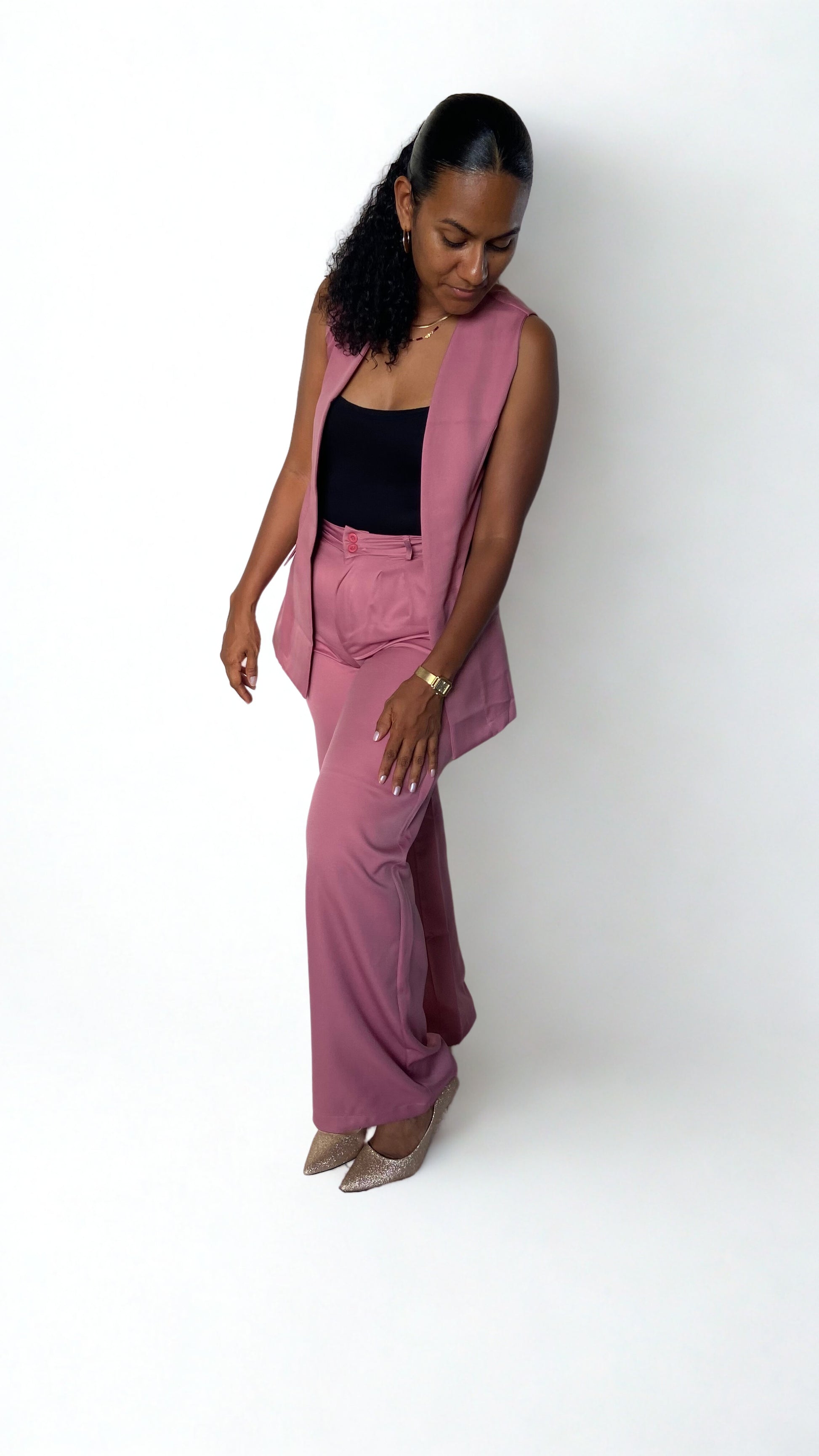 - Couleur : Veste noir profond & pantalon nude clair, un contraste subtil et raffiné